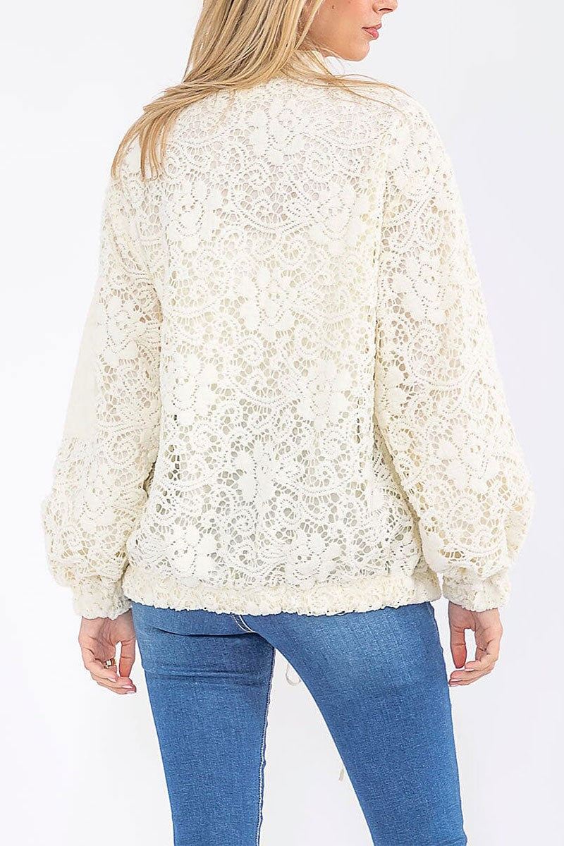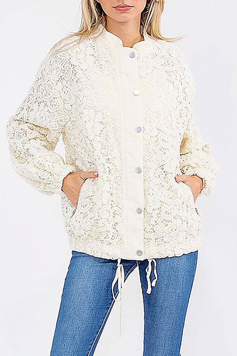 FIT: True to sizemore of a cream color then ivoryLONG SLEEVE BUTTON CLOSURE FRONT POCKETS CROCHET JACKET * 100% Polyester Lining: 100% Cotton.