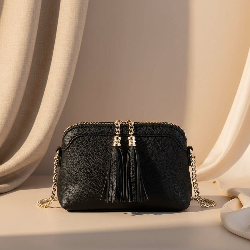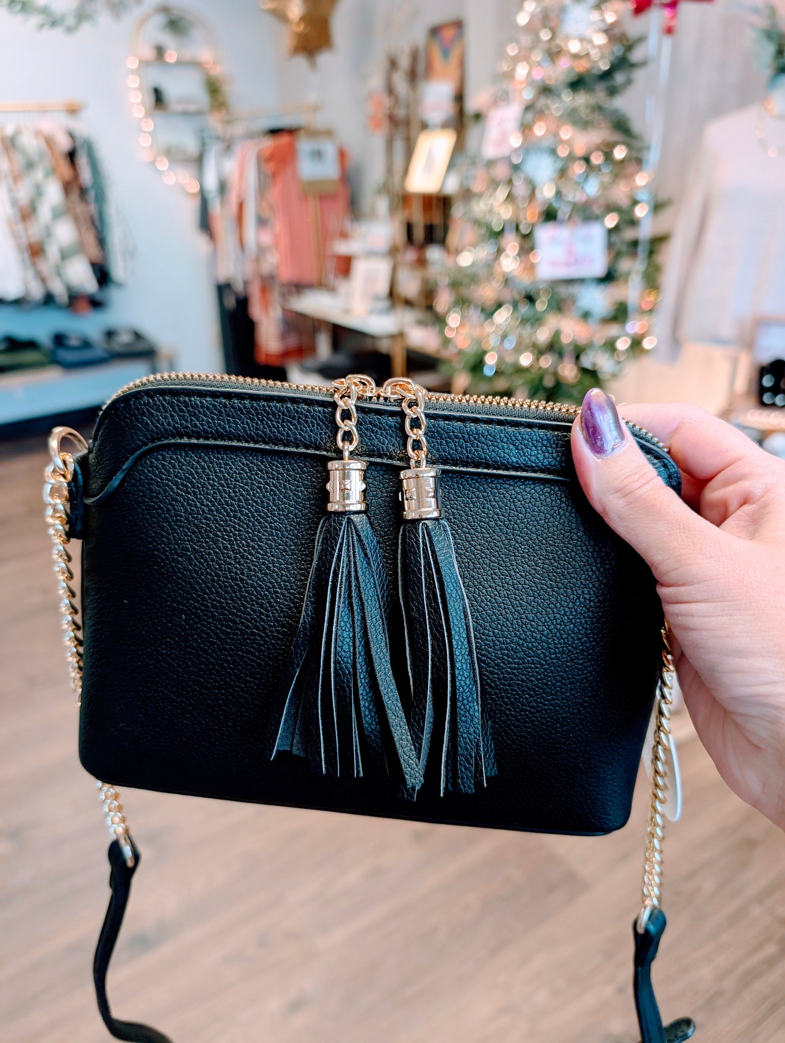Tassel Small Crossbody Bag with Chain Strap 8" (W) x 5.5" (H) x 3" (D) Tassel Zipper Closure 1 inside zipper pocket Adjustable Shoulder Strap with min. 22" to max. 25" drop Solid tone faux leather body, two tassel front, and gold tone hardware Ideal for small items like small wallet, card holder, cell phone, cosmetics, keys, and etc.