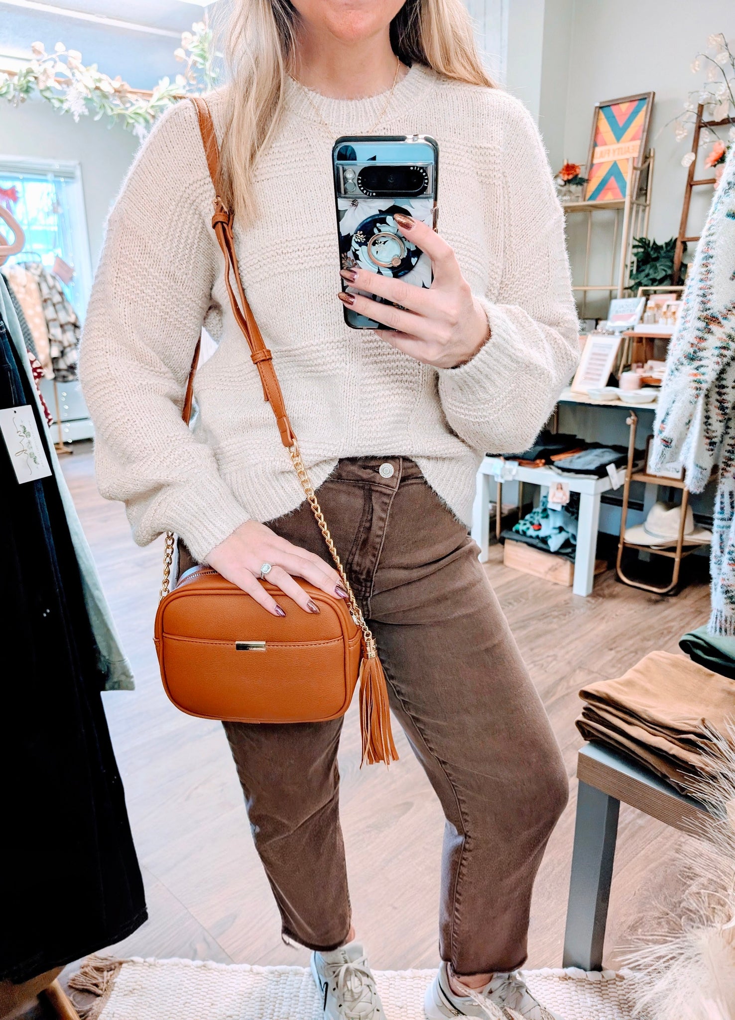8.75" (W) x 6.5" (H) x 3.25" (D) Tassel zipper Closure Adjustable Shoulder Strap with 22" min to 25" max drop Solid tone faux leather body, tassel accent, and gold tone hardware 1 front slip pocket (outside), 1 zipper pocket & 1 slip pocket (inside)