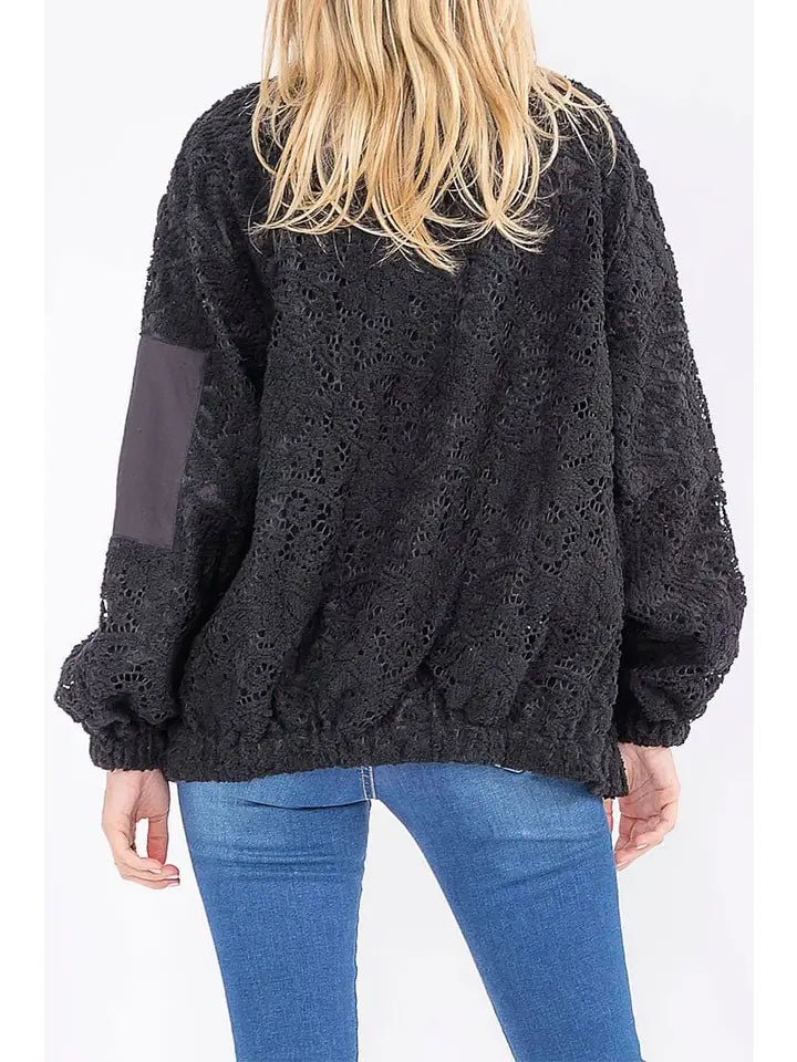FIT: True to sizemore of a cream color then ivoryLONG SLEEVE BUTTON CLOSURE FRONT POCKETS CROCHET JACKET * 100% Polyester Lining: 100% Cotton.