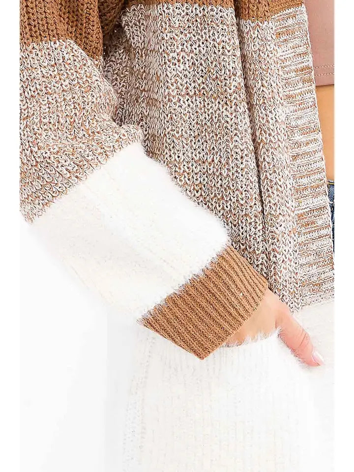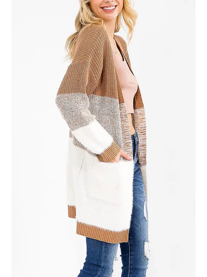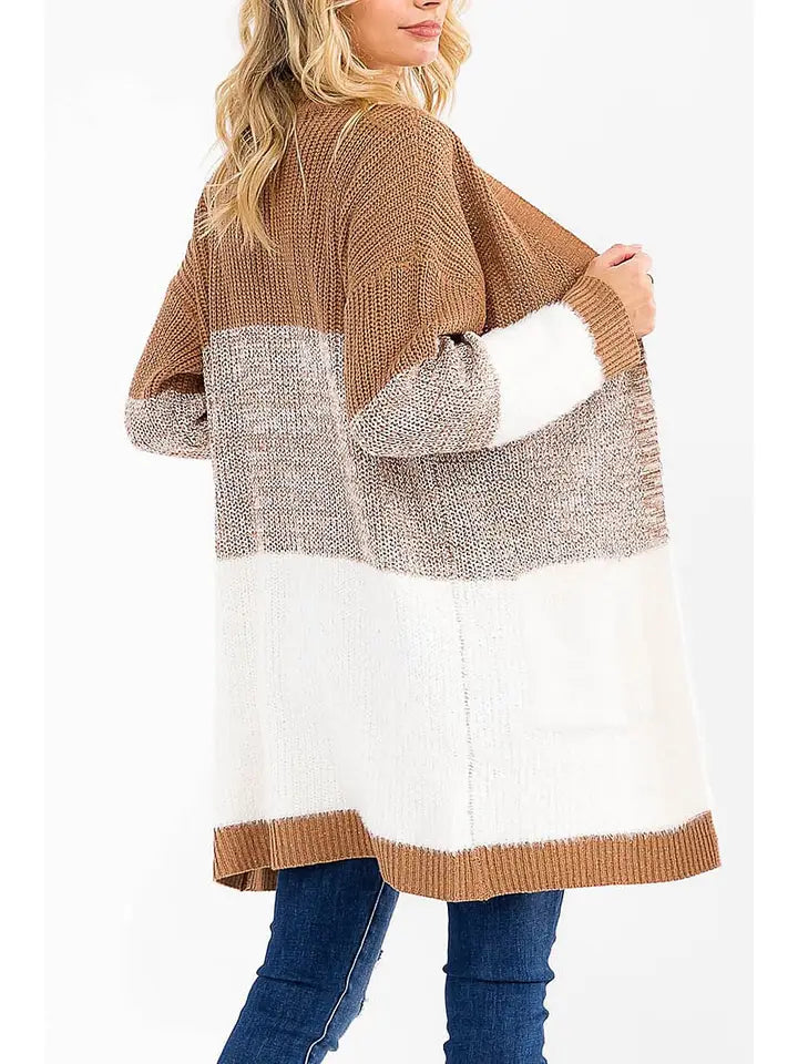 LONG SLEEVE OPEN FRONT POCKETS COLORBLOCK CARDIGAN* 100% Polyester.* Hand Wash.* Made in China.* Model is wearing size S/M Length: 29" Bust: 36" Waist: 19".
